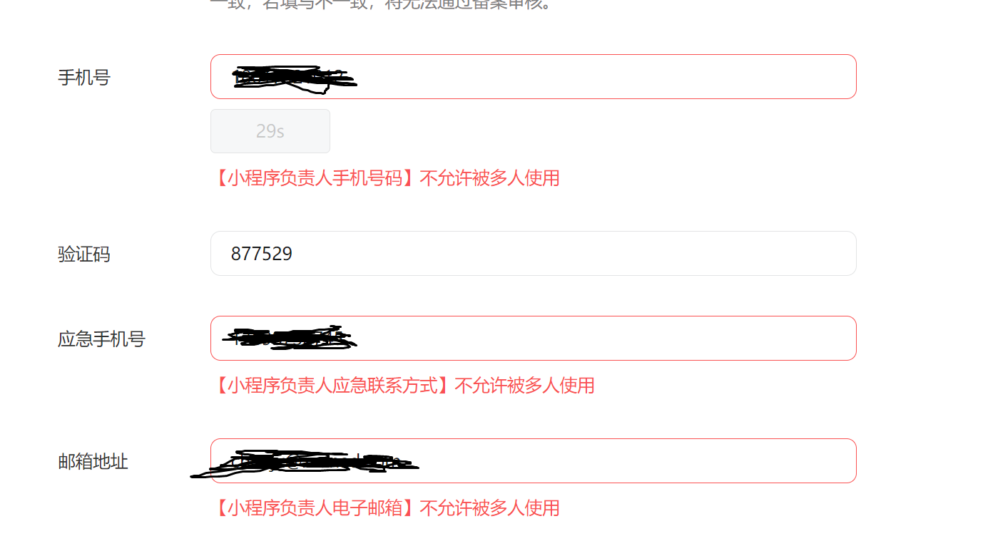 小程序备案失败后,重新修改后无法备案,会显示小程序负责人电话不允许被多人使用。修改的信息不含有电话号码及邮箱。