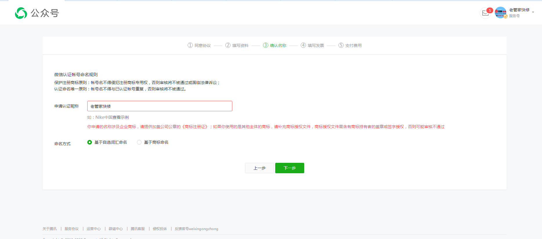 你好, 贵方可以先选择基于商标的命名方式提交认证,商标相关字段用其他证件(营业执照等)代替提交,审核人员后续核实后会更改为基于自选的命名方式认证。请了解