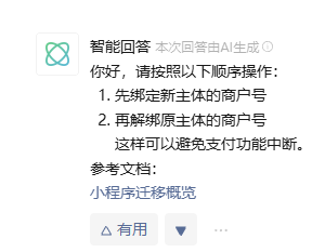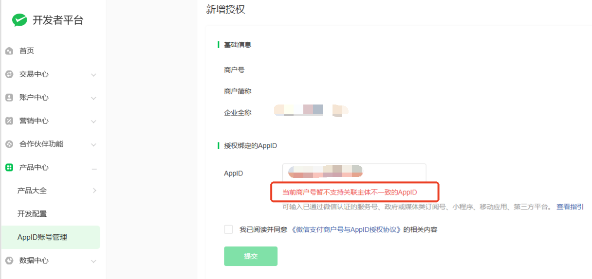 想请问下您回答的“绑定新主体的商户号”这边,我们现在按照操作说明,在新主体商户这里绑定不了小程序,提示暂时不支持关联主体不一致的APPID,要怎么办: