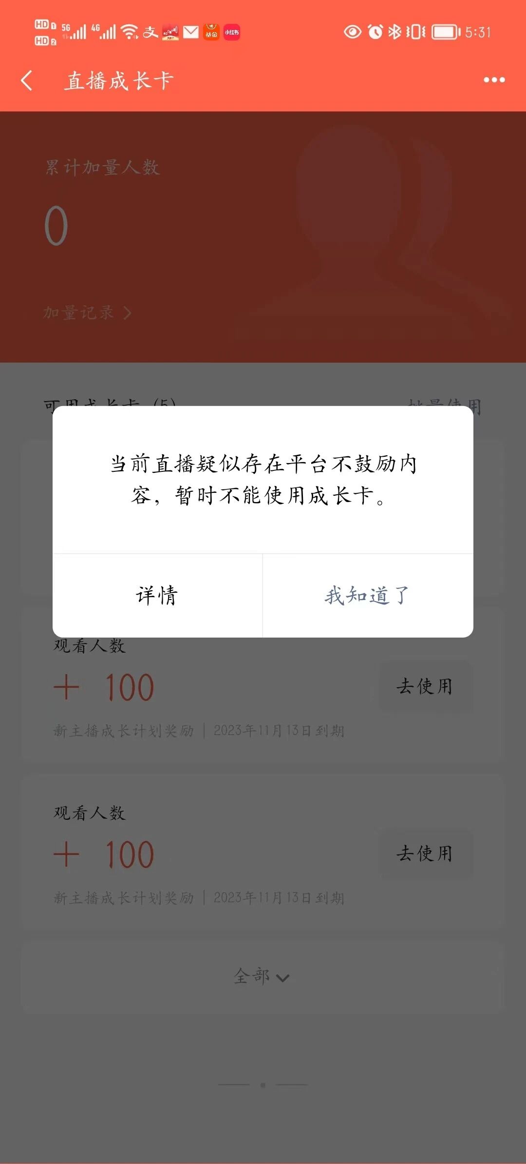 我们是中国燃气旗下品牌直播间,第一次直播中发现成长卡用不了,说是违规存在平台不鼓励内容,但我们看了一下直播信用分都是100分,完全不知道是哪里违规??给官方发邮件给我们通知在意见反馈里处理,但一直没有消息。请问有人也这样吗?怎么解决?