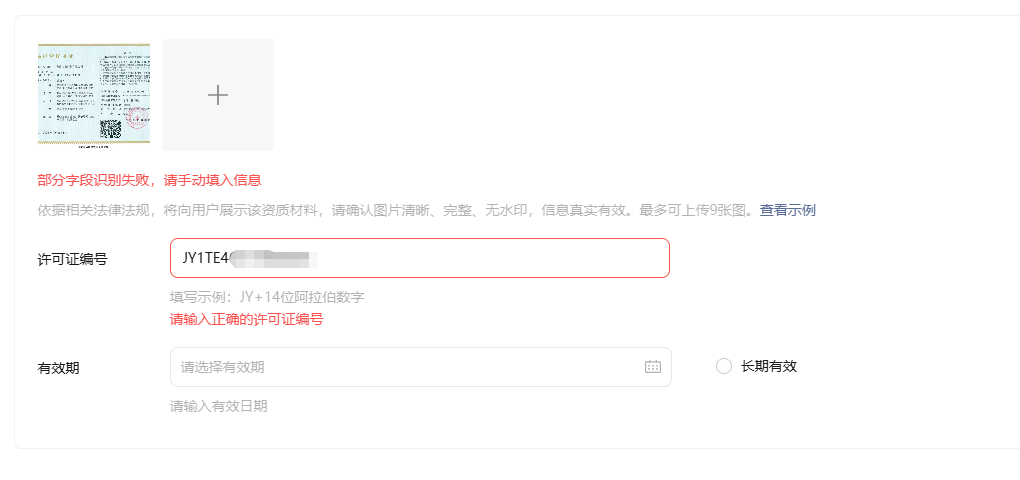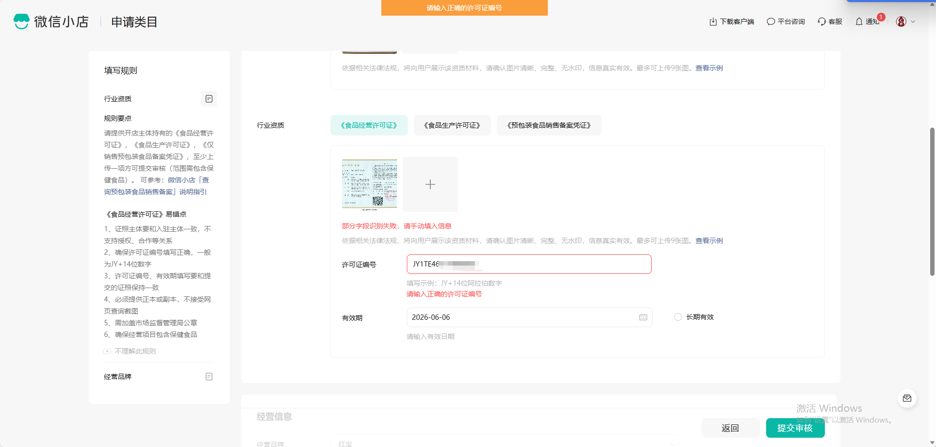 小店售卖食品上传需要食品经营许可证编号,微信平台规定编号是JY+14位阿拉伯数字,我们的编号是JY后面不是纯数字无法提交审批信息,如何解决?