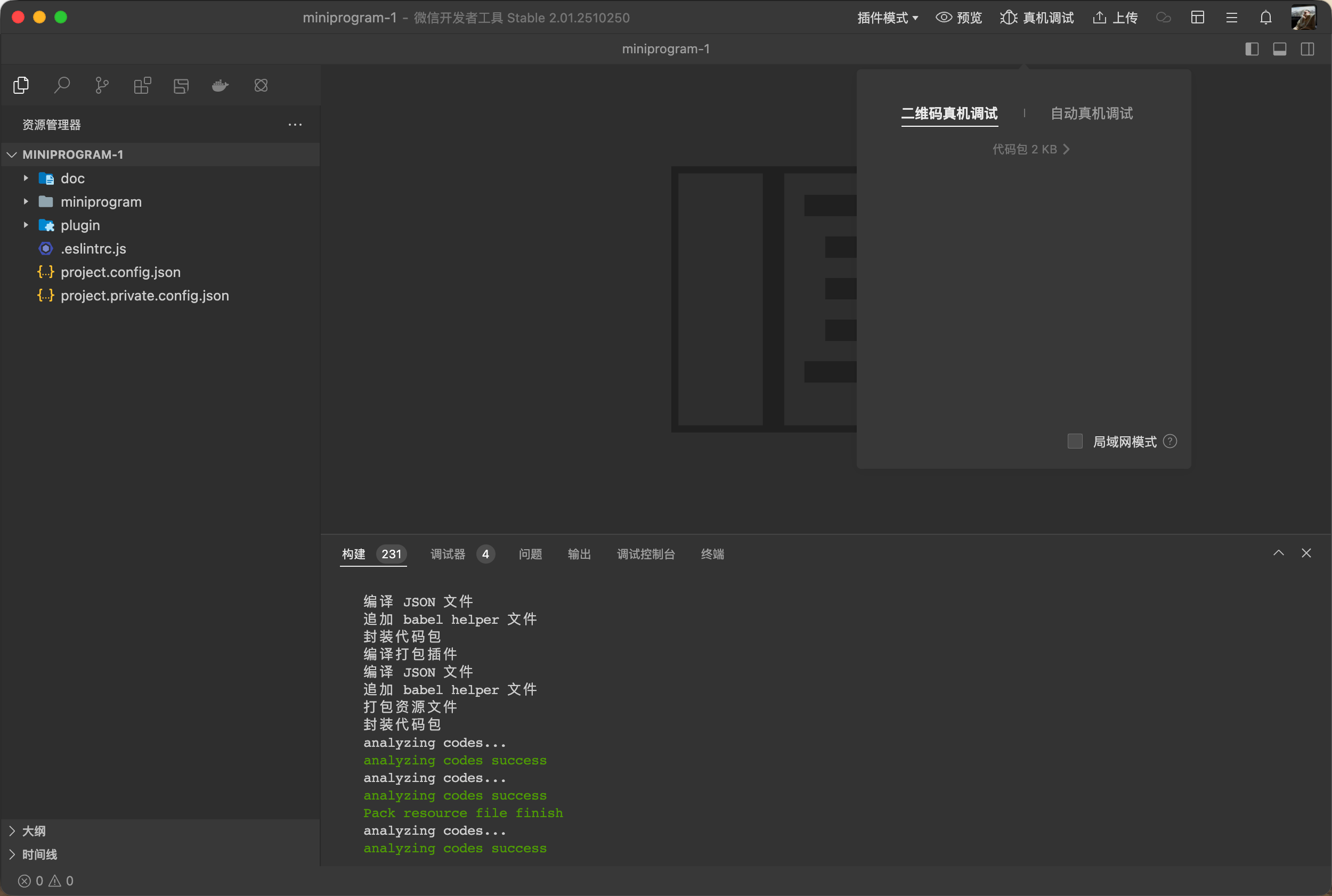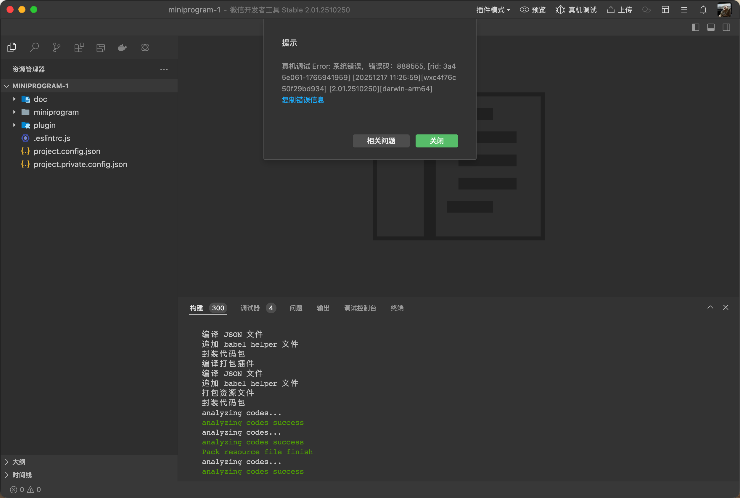 新创建一个小程序插件。默认状态,没做任何修改,点击真机调试,二维码调试,反复出现弹出这个下面两张图的状态,然后无法修改到自动真机调试