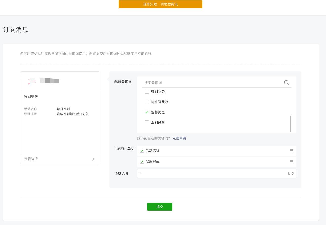 订阅消息模板创建,怎么一直显示:操作失败,请稍后再试