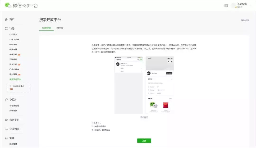 认证品牌名称,开通微主页小程序