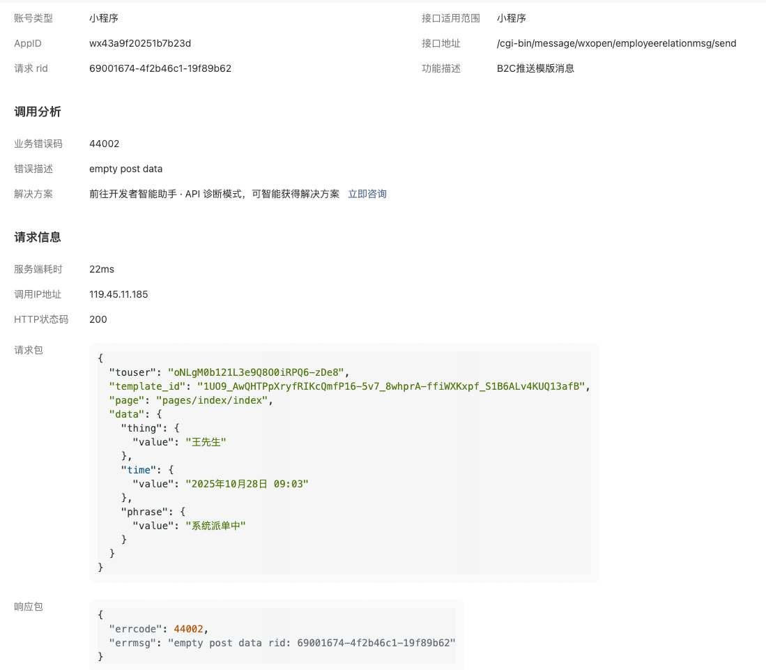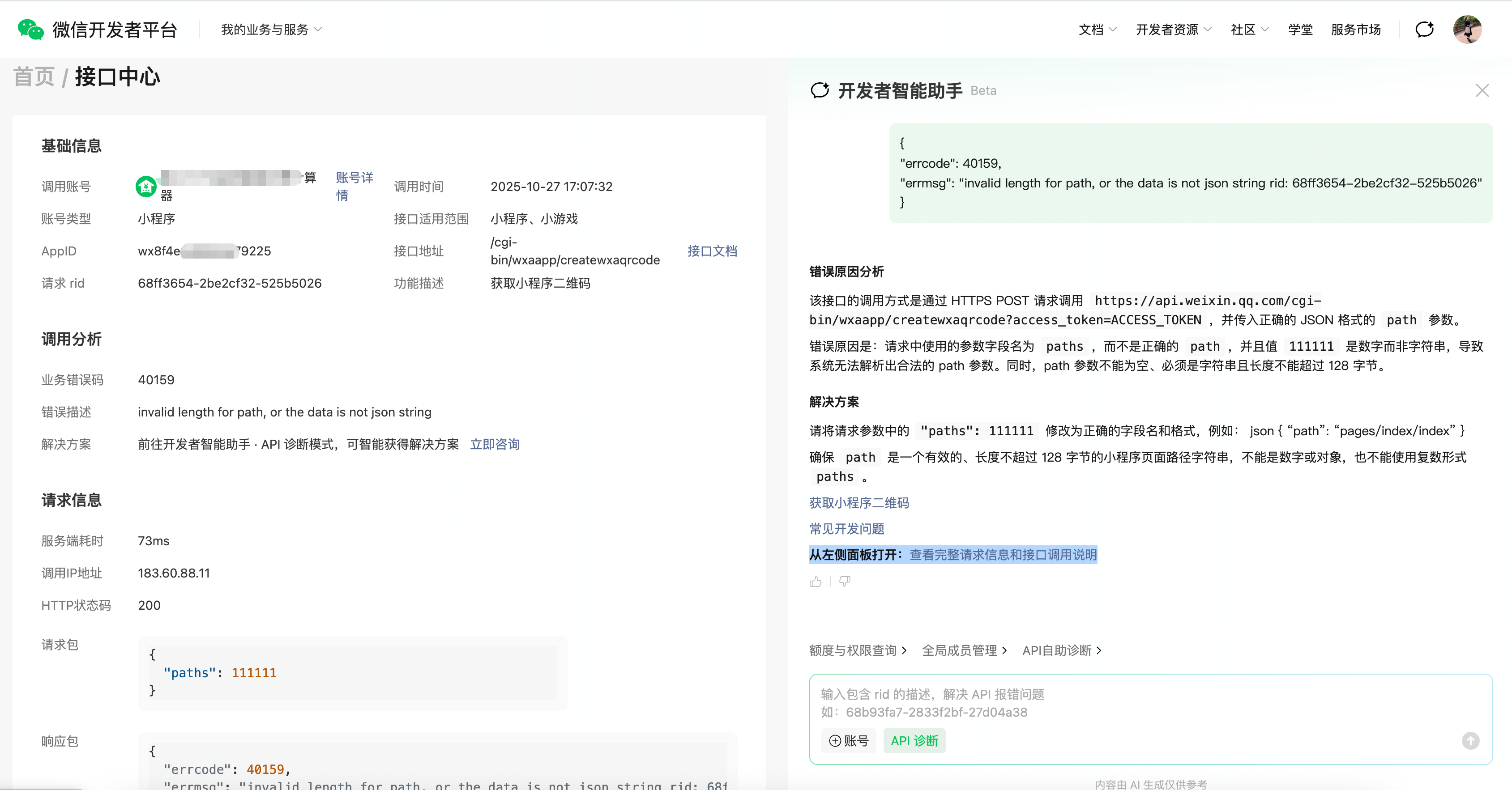 平台已上线 api 智能诊断功能,后续遇到服务端接口报错的问题,可通过rid一键智能诊断,详情可查看:https://developers.weixin.qq.com/doc/oplatform/developers/basic_func/aibot.html