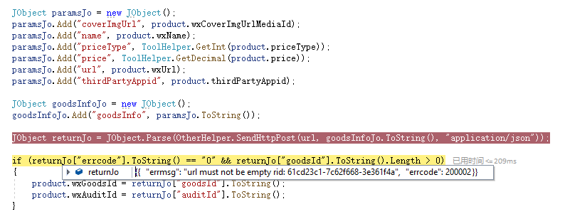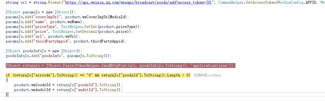 结帖,这里问题出现在封装数据上面,C#,直接用的JObject封装的,貌似不行,自己拼接了一下就可以了 "{\"goodsInfo\": {\"coverImgUrl\":\""+ product.wxCoverImgUrlMediaId + "\",\"name\":\""+ product.wxName + "\",\"url\":\""+product.wxUrl+"\",\"priceType\":\""+ ToolHelper.GetInt(product.priceType) + "\",\"price\":\""+ ToolHelper.GetDecimal(product.price) + "\"}}";