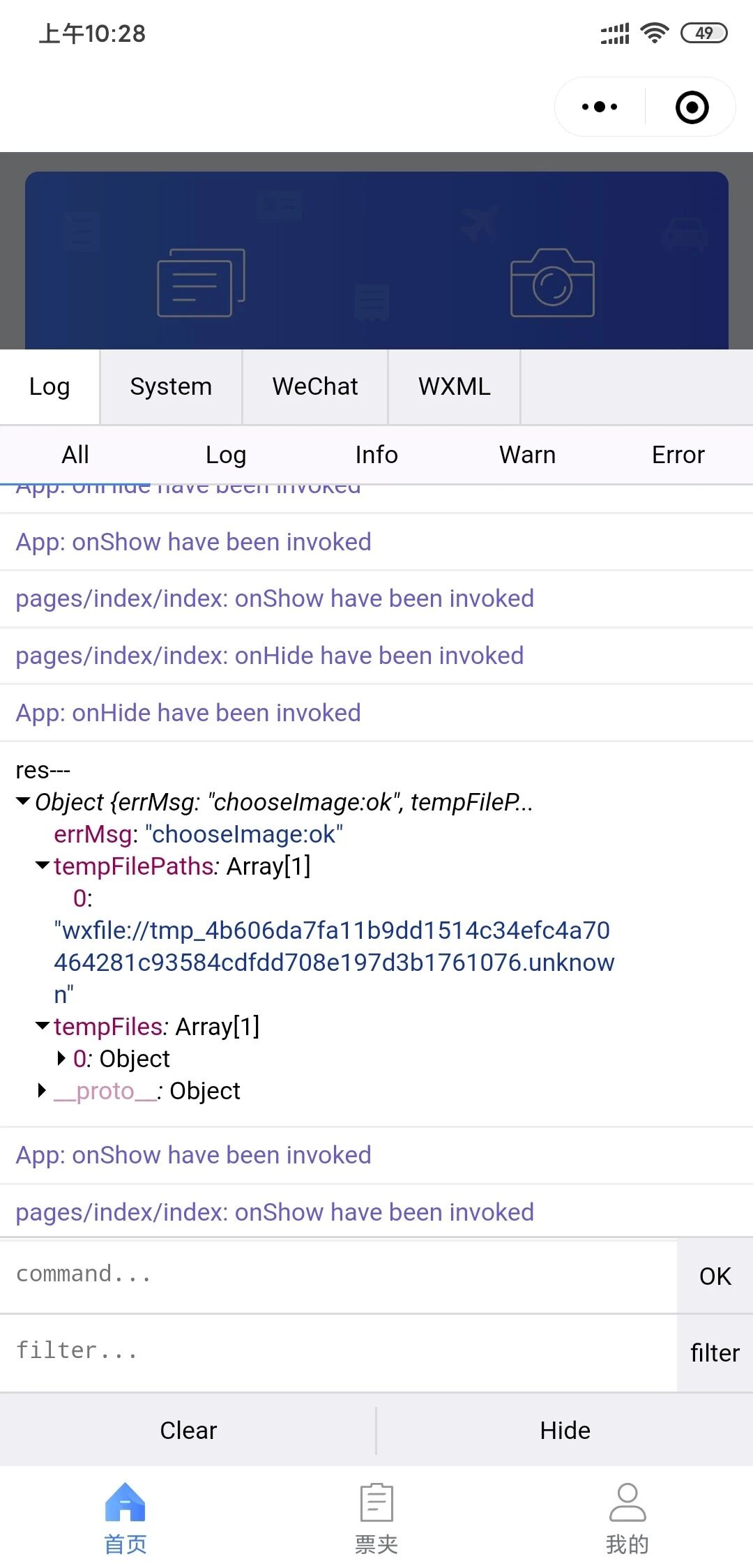 wx.chooseImage({ count: 1, sizeType: ['original'], sourceType: ['album', 'camera'], success(res) { console.log('res---',res); }