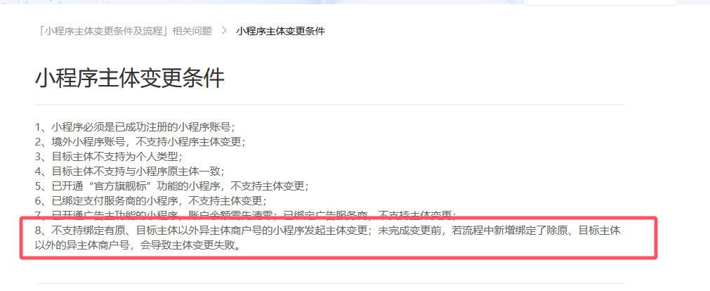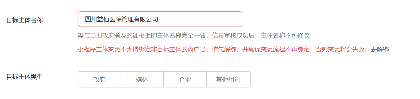 小程序可以绑定其他主体的商户号。但是绑定了除了原、目标主体外的主体商户号后,就不支持进行主体变更了。