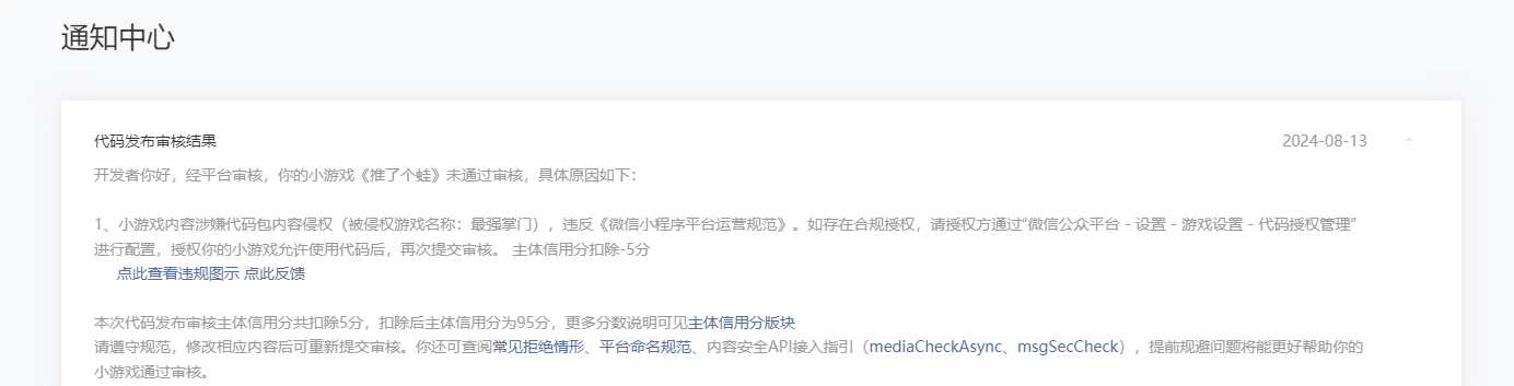 你所提交的反馈原因或相关举证材料涉及代码包公共库内容,请在下个版本提审时,移步微信公众平台版本提审入口,在[版本更新说明]中提交相关公共库链接举证,仅限于js 语言/提供 github项目链接且github release 版本(不得过审后删除)/非加密/非混淆/不含业务逻辑/相关项目说明,核心代码需有相应注释