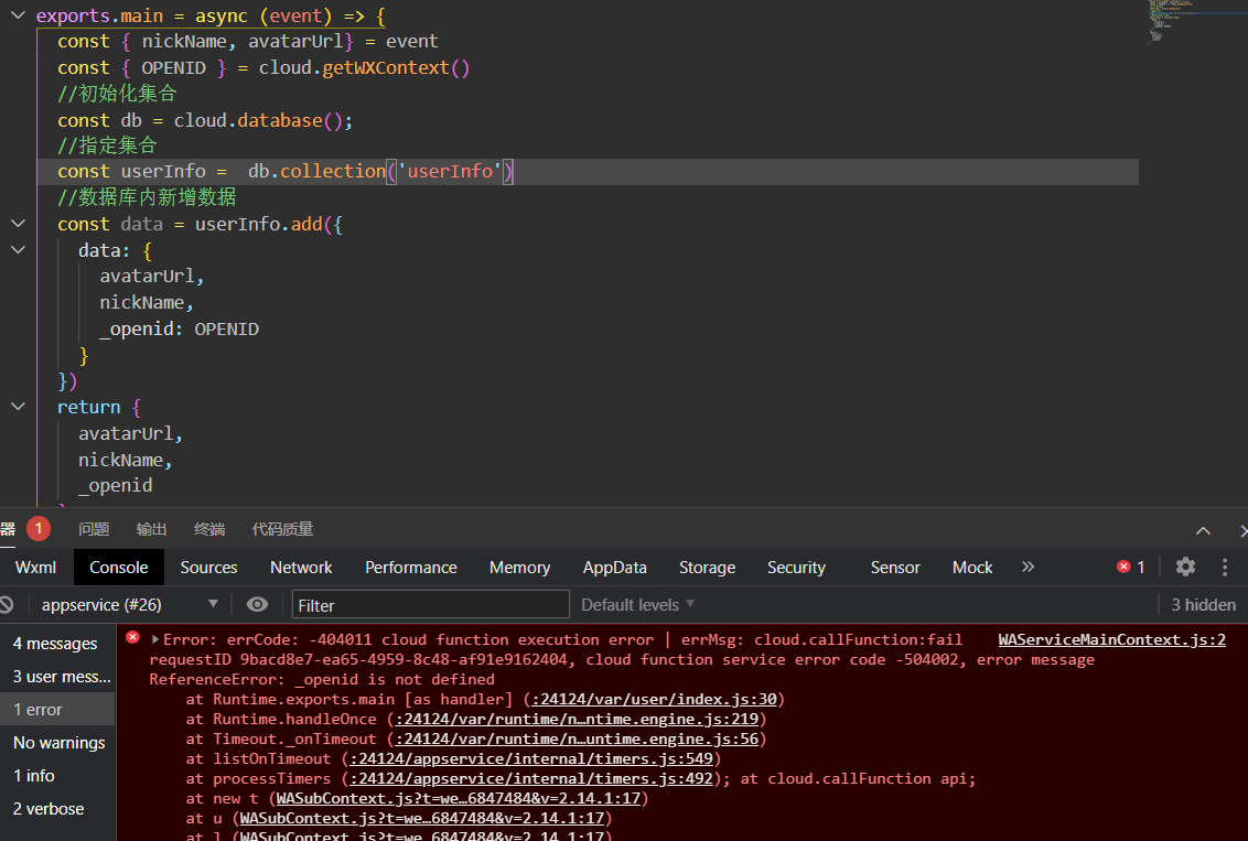 补充:即使报错,云数据库上也可以新增一条数据,比如预想新增数据有:昵称、头像和openid,实际上能新增的只有头像和openid,为什么呀?