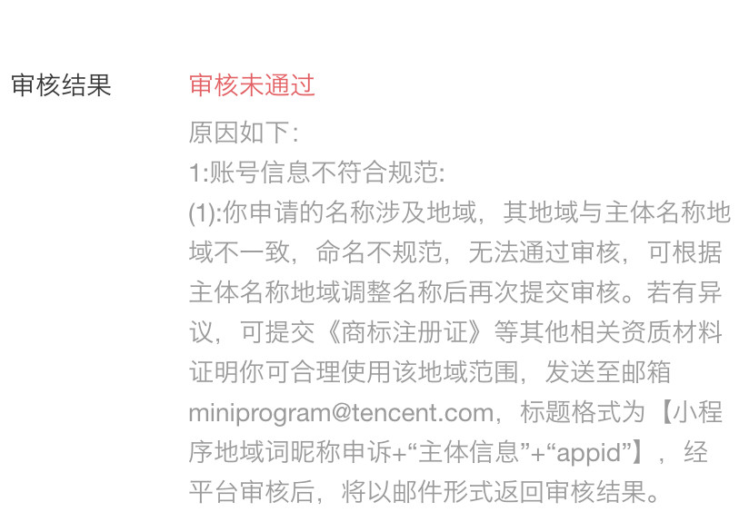 你好,若有代理授权书等证明贵方可合理使用该地域范围的相关资质材料,可按照审核返回结果发送至邮箱:miniprogram@tencent.com,标题格式为【小程序地域昵称申诉+“主体信息”+“appid”】,经平台审核后,一般将在7个工作日内以邮件形式返回审核结果。请了解