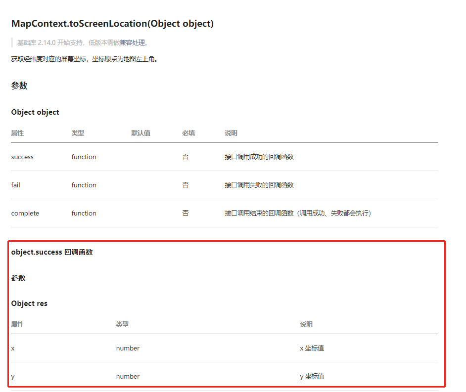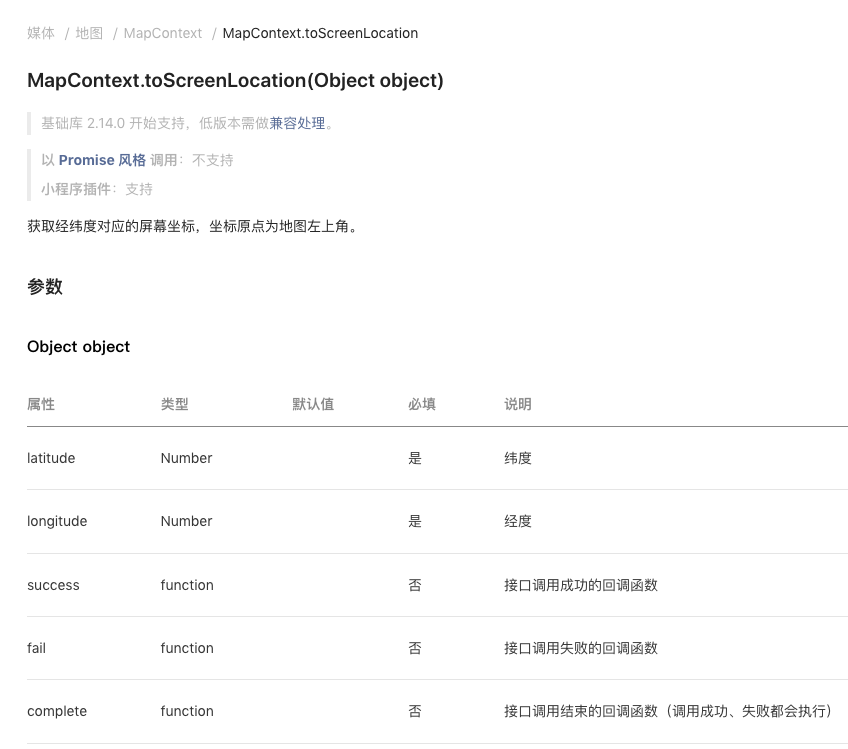 MapContext.toScreenLocation,文档没有提及传入经纬度,回调没有返回。即成功,失败,完成的回调都没有结果。