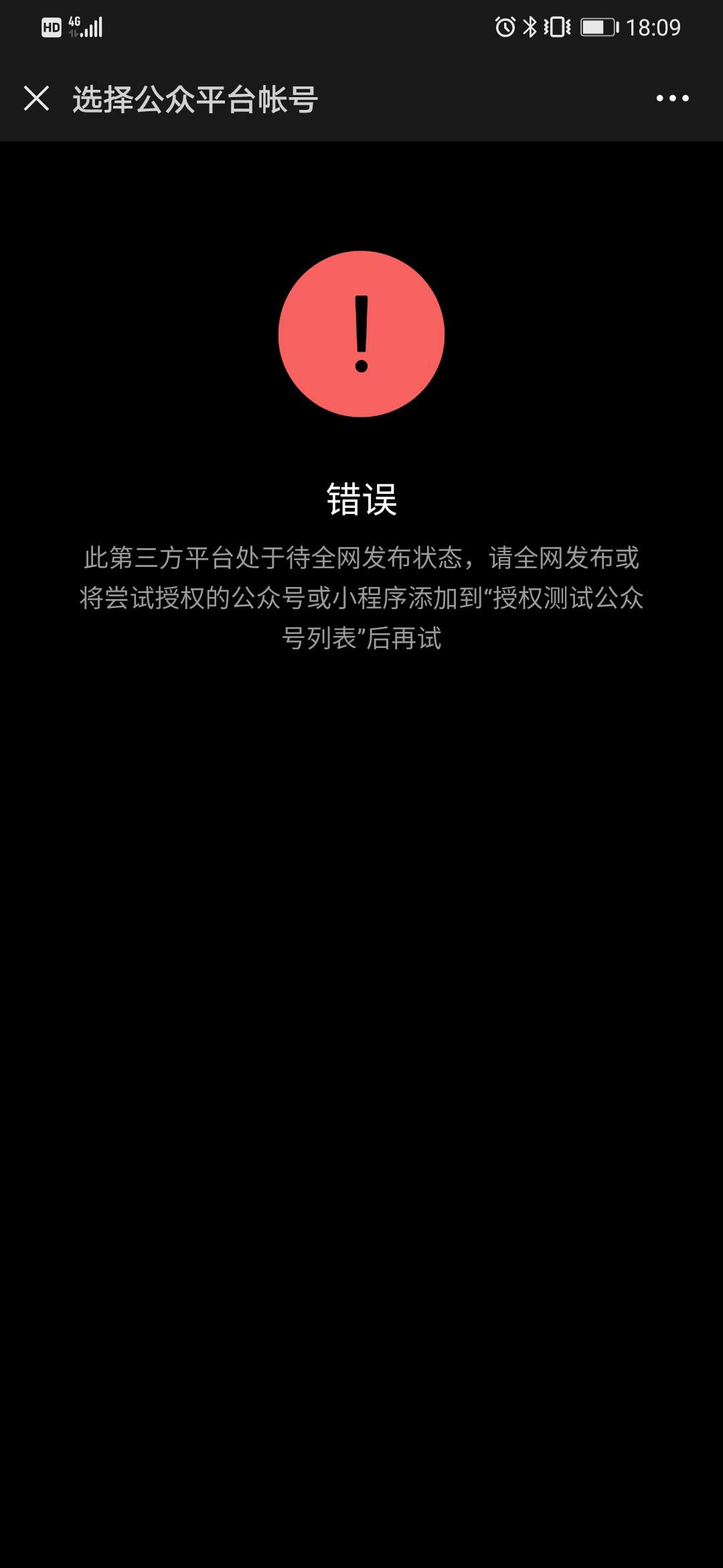 已添加测试公众号原始ID,依旧提示“ 此第三方平台处于待全网发布状态,请全网发布或将尝试授权的公众号或小程序添加到“授权测试公众号列表”后再试 ”。