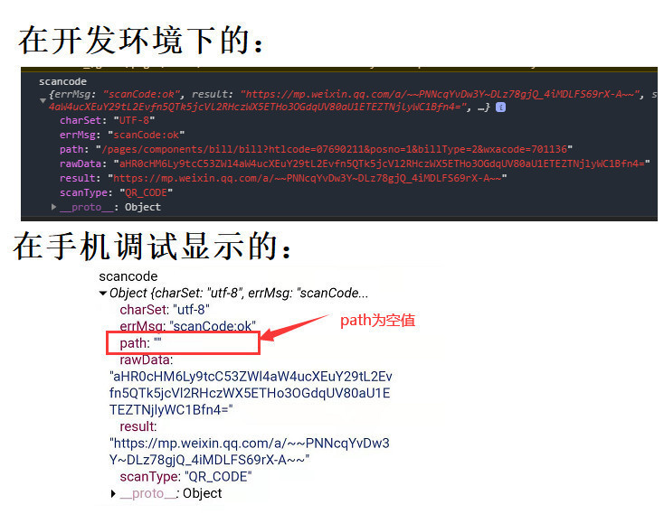 下图我是用createwxaqrcode生成小程序二维码,里面有path参数值,在开发环境里,wx.scanCode是可以正常读出path值的,但测试发现大部分手机里解析出来的path值是空的,仅仅一小部分手机是正常的,不知原因.