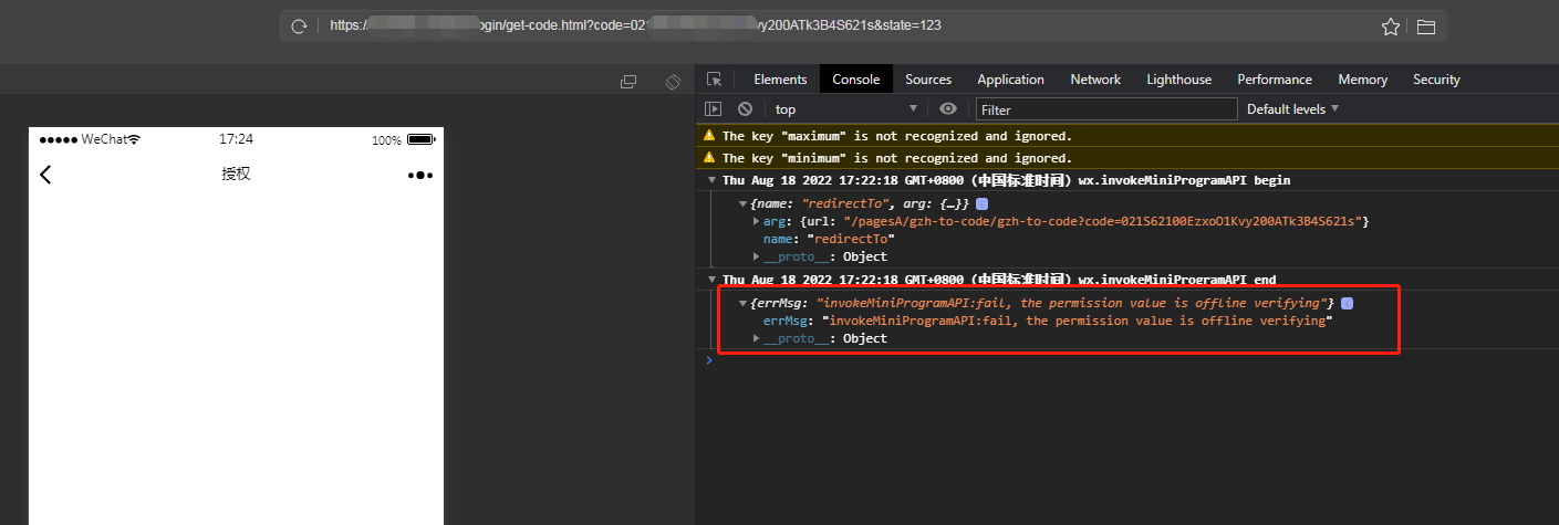 开发工具运行h5页面时,页面使用wx.miniProgram.redirectTo 跳转到小程序页面,但是报错 errMsg: "invokeMiniProgramAPI:fail, the permission value is offline verifying,不知道怎么回事",
