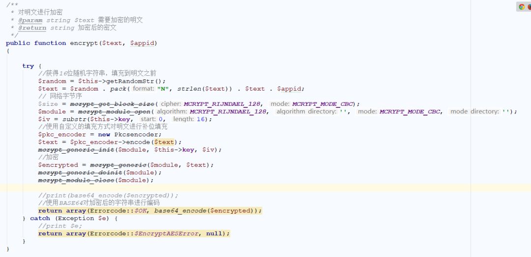 /*** 对明文进行加密* @param string $text 需要加密的明文* @return string 加密后的密文*/publicfunctionencrypt($text,$appid){try{//获得16位随机字符串,填充到明文之前$random=$this->getRandomStr();//"aaaabbbbccccdddd";$text=$random. pack("N",strlen($text)) .$text.$appid;$iv=substr($this->key, 0, 16);$pkc_encoder=newPkcsencoder();$text=$pkc_encoder->encode($text);$encrypted= openssl_encrypt($text,'AES-256-CBC',substr($this->key, 0, 32),OPENSSL_ZERO_PADDING,$iv);returnarray(ErrorCode::$OK,$encrypted);}catch(Exception$e) {//print $e;returnarray(Errorcode::$EncryptAESError, null);}}/*** 对密文进行解密* @param string $encrypted 需要解密的密文* @return string 解密得到的明文*/publicfunctiondecrypt($encrypted,$appid){try{$iv=substr($this->key, 0, 16);$decrypted= openssl_decrypt($encrypted,'AES-256-CBC',substr($this->key, 0, 32),OPENSSL_ZERO_PADDING,$iv);}catch(Exception$e) {returnarray(Errorcode::$DecryptAESError, null);}try{//去除补位字符$pkc_encoder=newPkcsencoder();$result=$pkc_encoder->decode($decrypted);//去除16位随机字符串,网络字节序和AppIdif(strlen($result) < 16)returnarray('出错啦');$content=substr($result, 16,strlen($result));$len_list= unpack("N",substr($content, 0, 4));$xml_len=$len_list[1];$xml_content=substr($content, 4,$xml_len);$from_appid=substr($content,$xml_len+ 4);}catch(Exception$e) {//print $e;returnarray(Errorcode::$IllegalBuffer, null);}if($from_appid!=$appid)returnarray(Errorcode::$ValidateAppidError, null);returnarray(0,$xml_content,$from_appid);}你好,请问Pkcsencoder这个类方法是什么样子的呢