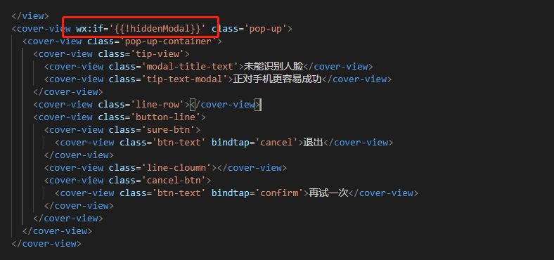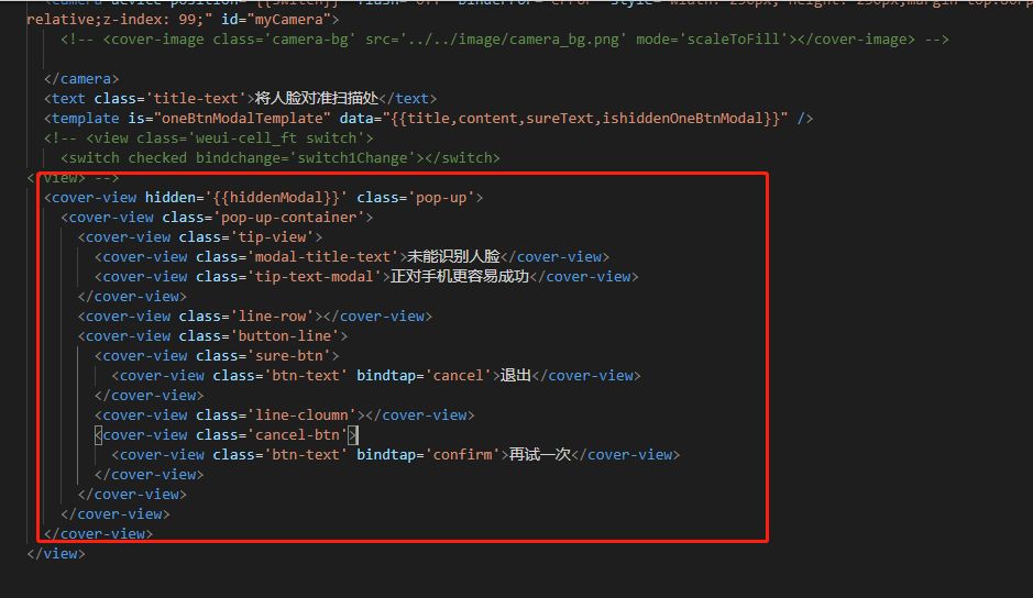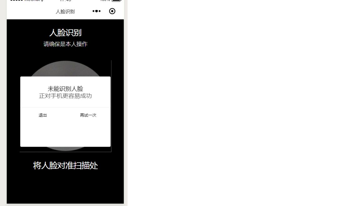 <view class='whole-bg'> <text class='title-text'>人脸识别</text> <text class='tip-text'>请确保是本人操作</text> <camera device-position="{{switch}}" flash="off" binderror="error" style="width: 250px; height: 250px;margin-top:80rpx;position: relative;z-index: 99;" id="myCamera"> <!-- <cover-image class='camera-bg' src='../../image/camera_bg.png' mode='scaleToFill'></cover-image> --> <cover-view hidden='{{hiddenModal}}' class='pop-up'> <cover-view class='pop-up-container'> <cover-view class='tip-view'> <cover-view class='modal-title-text'>未能识别人脸</cover-view> <cover-view class='tip-text-modal'>正对手机更容易成功</cover-view> </cover-view> <cover-view class='line-row'></cover-view> <cover-view class='button-line'> <cover-view class='sure-btn'> <cover-view class='btn-text' bindtap='cancel'>退出</cover-view> </cover-view> <cover-view class='line-cloumn'></cover-view> <cover-view class='cancel-btn'> <cover-view class='btn-text' bindtap='confirm'>再试一次</cover-view> </cover-view> </cover-view> </cover-view> </cover-view> </camera> <text class='title-text'>将人脸对准扫描处</text> <template is="oneBtnModalTemplate" data="{{title,content,sureText,ishiddenOneBtnModal}}" /> <!-- <view class='weui-cell_ft switch'> <switch checked bindchange='switch1Change'></switch></view> --></view> |