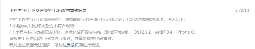 你好,经核实,贵方小程序功能无法体验,建议提供可登录体验的测试账号信息,填写在 版本描述处提交,以便审核人员及时体验到小程序功能。(详图如下)