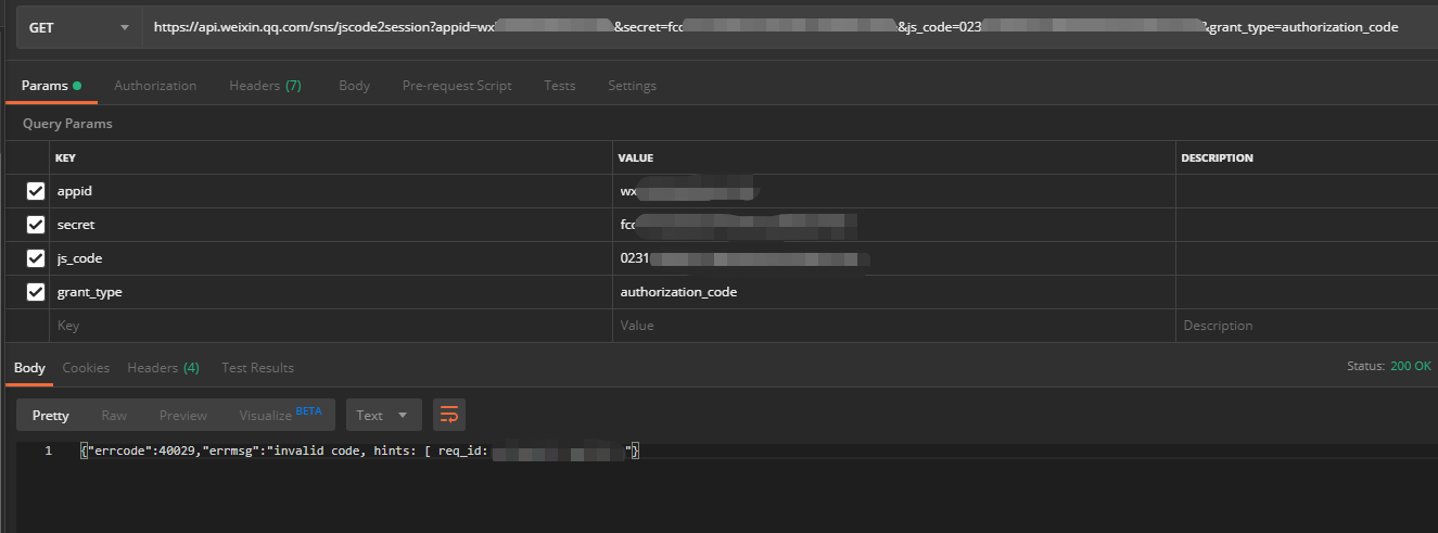 {"errcode":40029,"errmsg":"invalid code, hints: [ req_id: OlKAMfyFe-hbIKNa ]"}