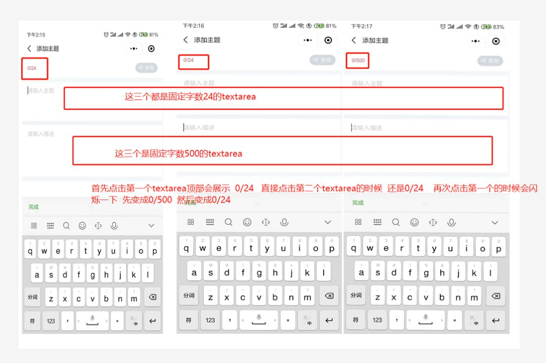 不收起键盘直接点第二个textarea还是提示“计划进来了”,正常应该提示‘情况进来了’。这时提交按钮也失效了。