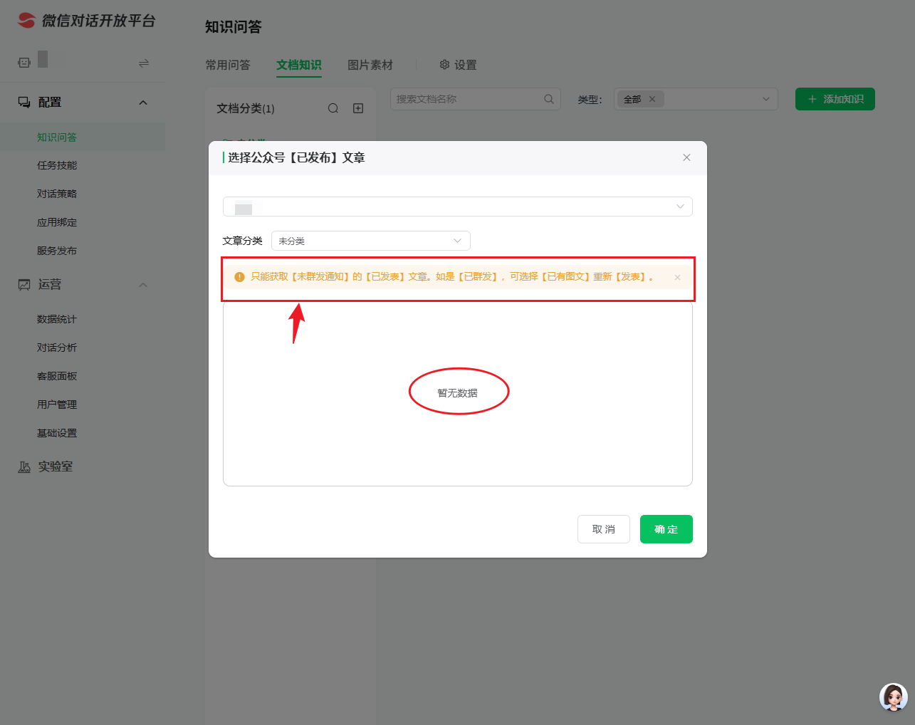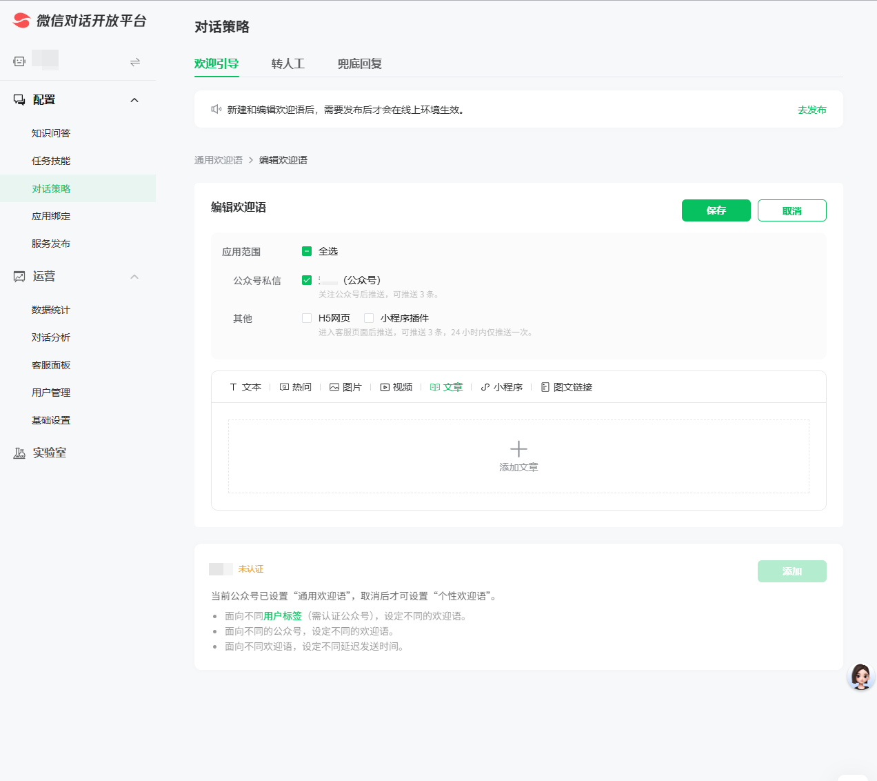 但是在「微信对话开放平台-配置-对话策略-欢迎引导-通用欢迎语-编辑欢迎语-文章」中,显示的是【暂无数据】,(见微信对话开放平台截图)。