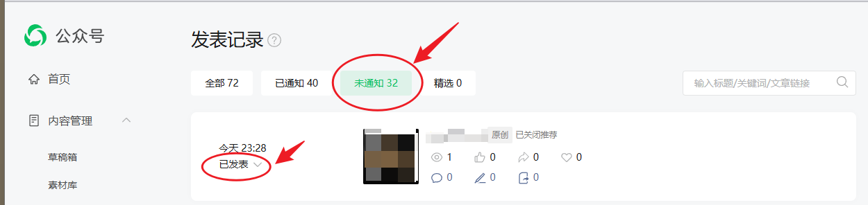 「公众号」的文章【未群发通知】且【已发表】,(见公众号截图),
