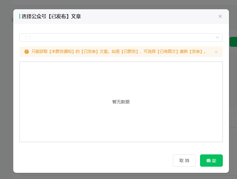 页面提示:只能获取【未群发通知】的【已发表】文章。如是【已群发】,可选择【已有图文】重新【发表】。