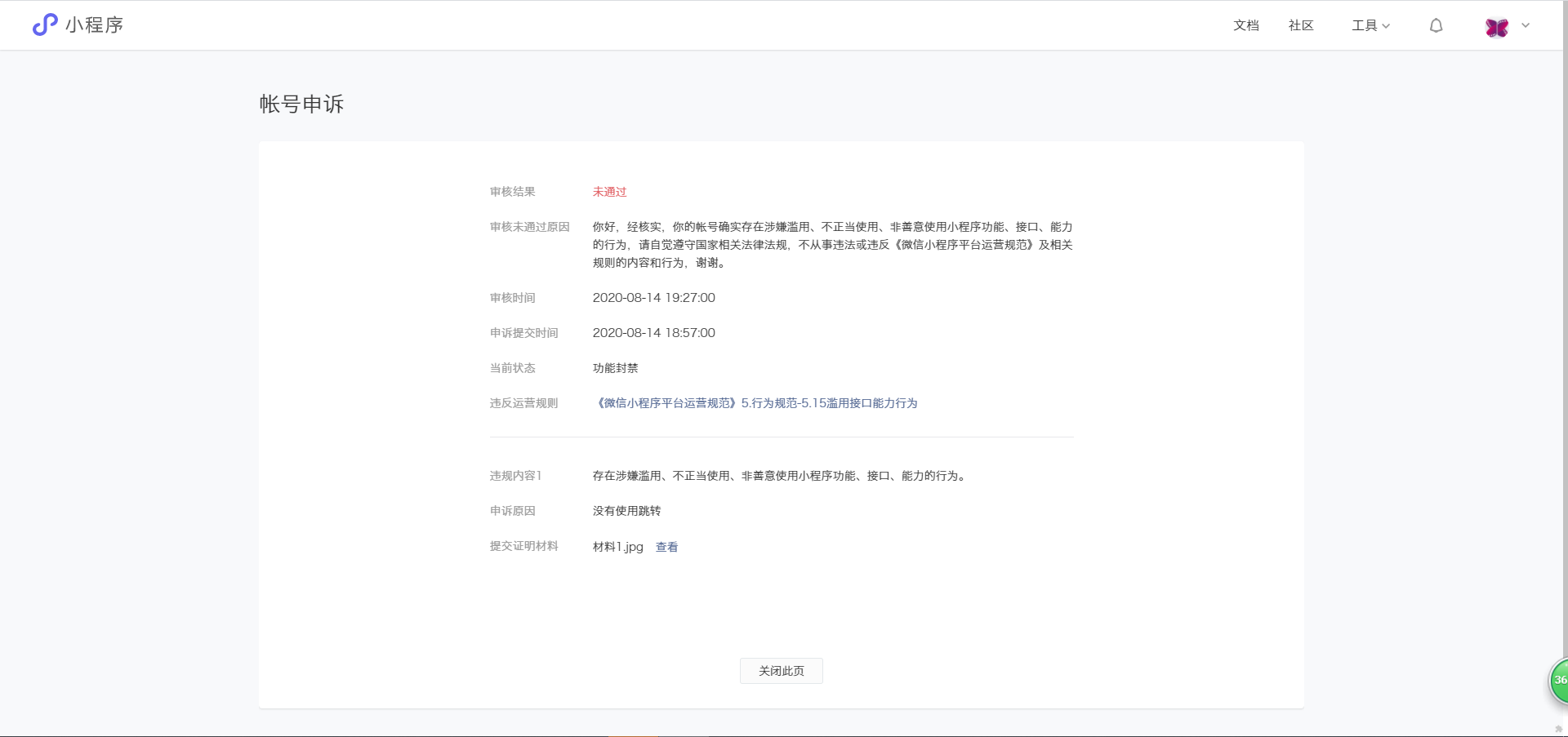 你好,经核实,你的帐号确实存在涉嫌滥用、不正当使用、非善意使用小程序功能、接口、能力的行为,请自觉遵守国家相关法律法规,不从事违法或违反《微信小程序平台运营规范》及相关规则的内容和行为,谢谢。