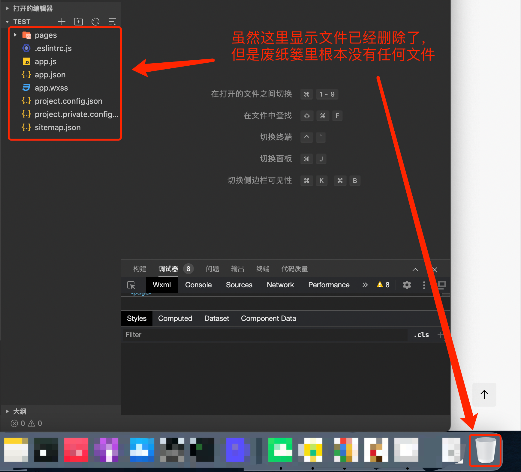 2、删除文件后显示目录确实被删掉了,但是废纸篓却没有新的被删除文件进来