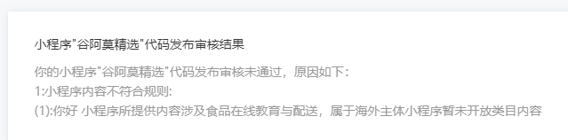 你好,小程序所提供内容涉及食品的在线交易及配送,属于海外主体小程序暂未开放类目内容,请修改后再提交代码审核。