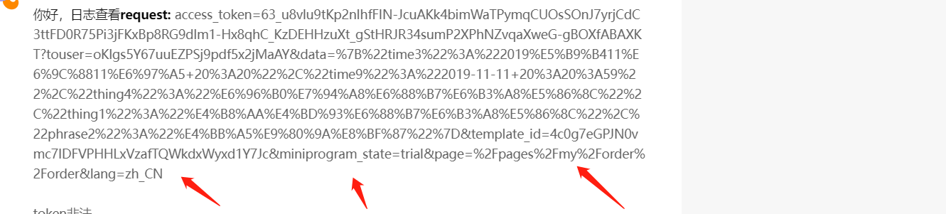 你好,日志查看request: access_token=63_u8vlu9tKp2nIhfFIN-JcuAKk4bimWaTPymqCUOsSOnJ7yrjCdC3ttFD0R75Pi3jFKxBp8RG9dlm1-Hx8qhC_KzDEHHzuXt_gStHRJR34sumP2XPhNZvqaXweG-gBOXfABAXKT?touser=oKlgs5Y67uuEZPSj9pdf5x2jMaAY&data=%7B%22time3%22%3A%222019%E5%B9%B411%E6%9C%8811%E6%97%A5+20%3A20%22%2C%22time9%22%3A%222019-11-11+20%3A20%3A59%22%2C%22thing4%22%3A%22%E6%96%B0%E7%94%A8%E6%88%B7%E6%B3%A8%E5%86%8C%22%2C%22thing1%22%3A%22%E4%B8%AA%E4%BD%93%E6%88%B7%E6%B3%A8%E5%86%8C%22%2C%22phrase2%22%3A%22%E4%BB%A5%E9%80%9A%E8%BF%87%22%7D&template_id=4c0g7eGPJN0vmc7IDFVPHHLxVzafTQWkdxWyxd1Y7Jc&miniprogram_state=trial&page=%2Fpages%2Fmy%2Forder%2Forder&lang=zh_CN