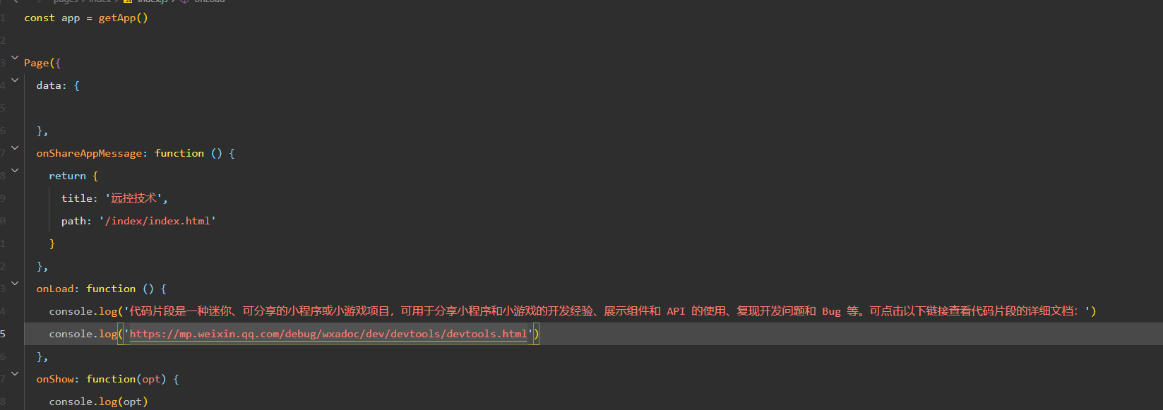 console.log('代码片段是一种迷你、可分享的小程序或小游戏项目,可用于分享小程序和小游戏的开发经验、展示组件和 API 的使用、复现开发问题和 Bug 等。可点击以下链接查看代码片段的详细文档:')