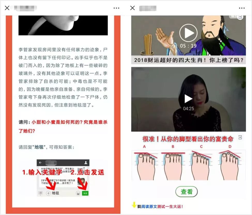 利用标题引发用户好奇心,诱导用户点击,跳转内容实为关注公众号。