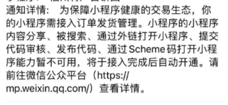 今天客户莫名其妙出现了一个通知,提示要对接发货管理。导致客户小程序无法正常运营。