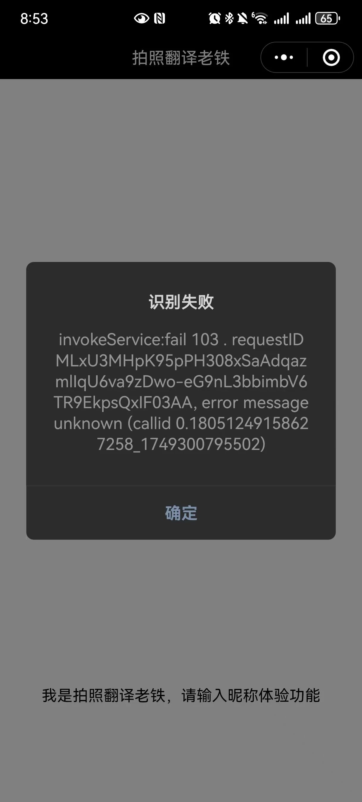 这是我的ocr调用代码,始终无法成功调用。刚写好代码的时候,wx.serviceMarket.invokeService是有报错的,提示我wx没有serviceMarket这个类,然后我点了一下快速修复,那个报错就没了。但是后续始终无法成功调用这个函数。以下是我实机测试的时候,遇到的报错。