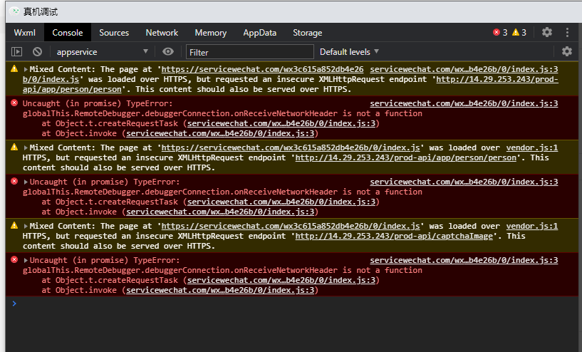 小程序移动端都正常,但是用pc端打开都是白屏,前面是体验版出现这个问题,现在是线上的版本也出现了,查询原因,启用pc端真机调试,发现报错:servicewechat.com/wx3c615a852db4e26b/0/index.js:3 Uncaught (in promise) TypeError: globalThis.RemoteDebugger.debuggerConnection.onReceiveNetworkHeader is not a function