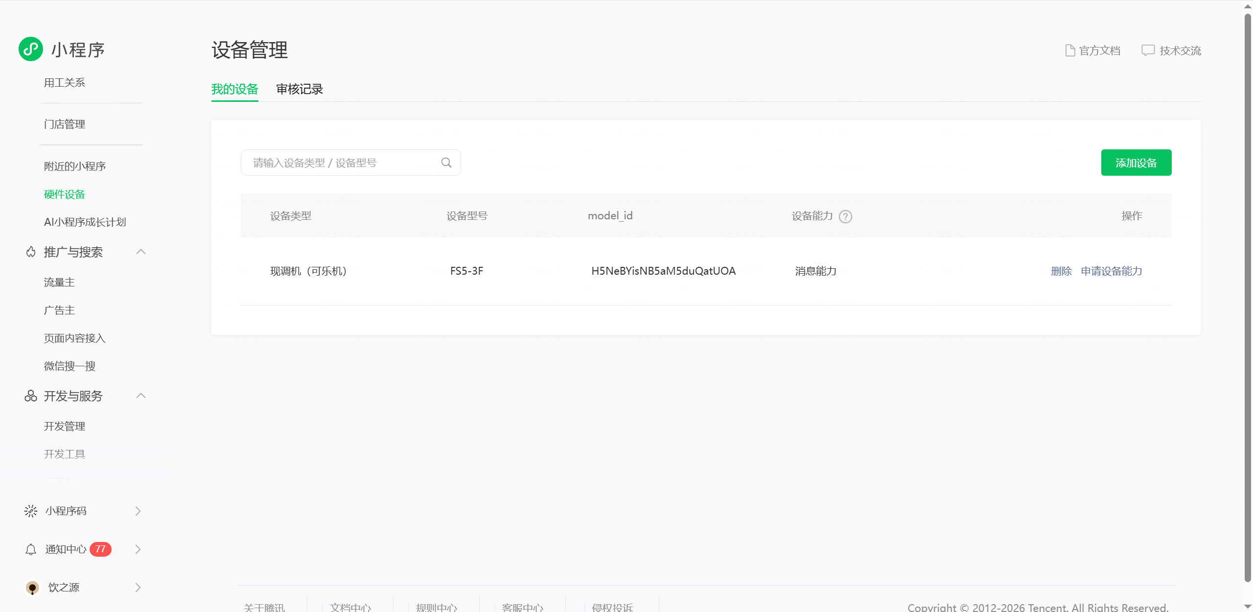 你好,1)标题名称不能有品牌或其他个性化字词等没有行业通用性的内容的,建议修改为:设备运行异常提醒;2)关键词“设备、原因”建议修改为:设备名称、异常原因;3)请提供小程序账号后台-硬件设备-我的设备处的截图