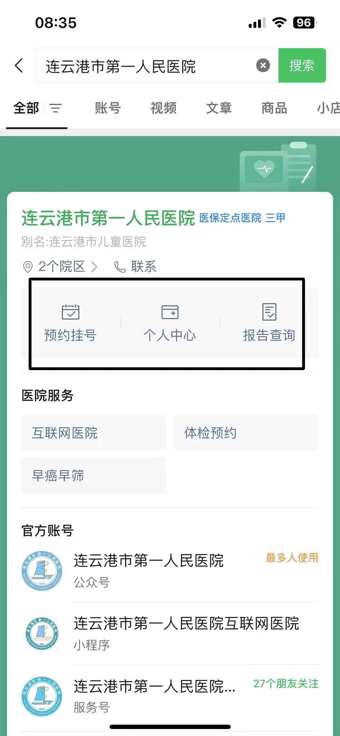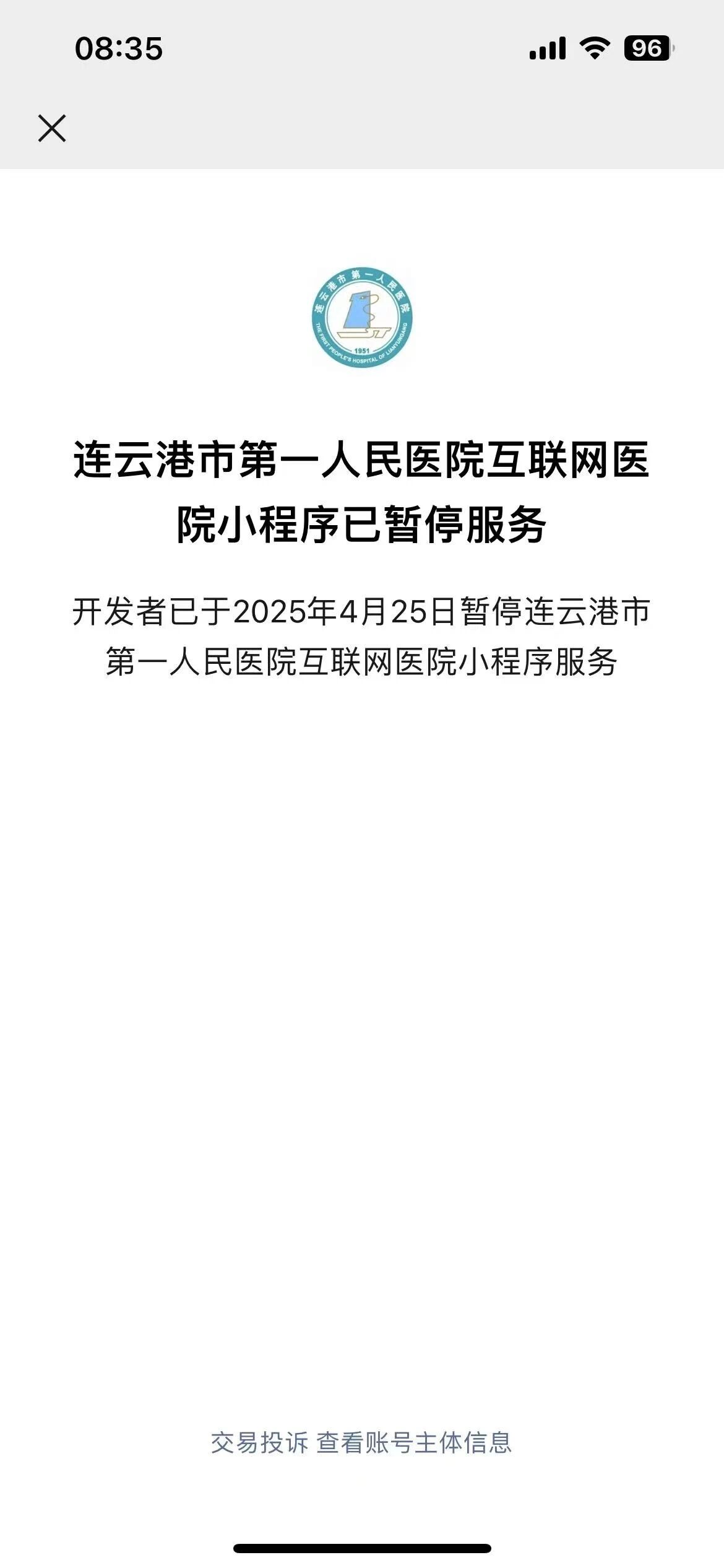 连云港市第一人民医院原来小程序已暂停服务,但是通过搜索‘连云港市第一人民医院’微信公众号,下面【预约挂号】、【个人中心】、【报告查询】还是跳转到了老的小程序上,导致大批患者投诉,需要跳转到新的小程序首页,新的小程序APPID:wxae264a76cc739f36。请处理。