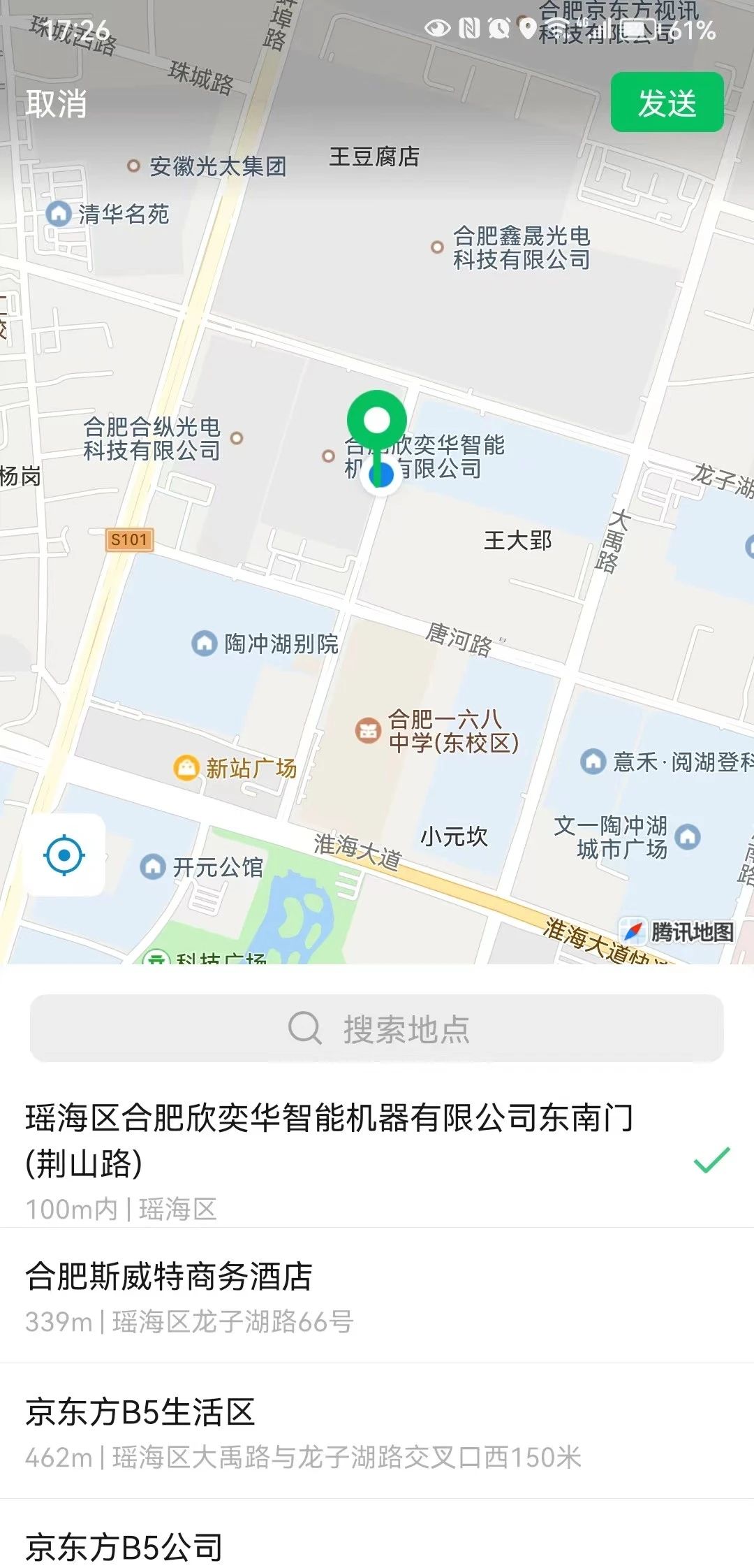 这个是我们使用wx.getLocation ; type=wgs84 获取到的经纬度值31.946278,117.32907 ; 图一这个是客户使用微信自身定位位置
