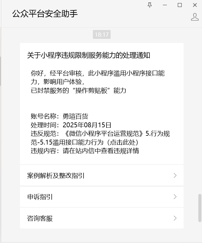 小程序不存在诱导外链,均为正常跳转功能,想知道为什么会被封禁?