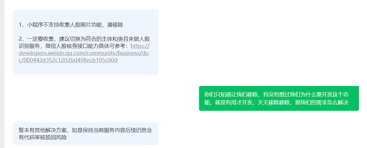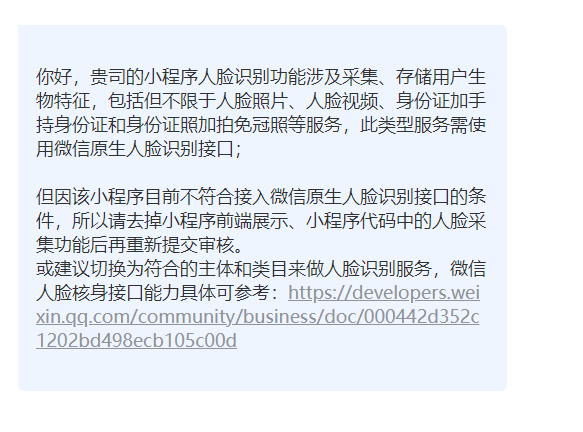 服务类目:教育服务-教育设备 主营 素质教育, 不支持使用人脸核身校验,我们也不需要使用在线人脸识别,但需要上传相片进行学校校卡制作以及校园刷脸进出,现在我们的使用场景就是需要采集相片,又不需要用到在线人脸核验,审核人员一直小程序不支持收集人脸照片服务功能驳回,一直让我开通人脸核验功能,这种情况怎么解决? appId: wxebbf11be0b9c0e18