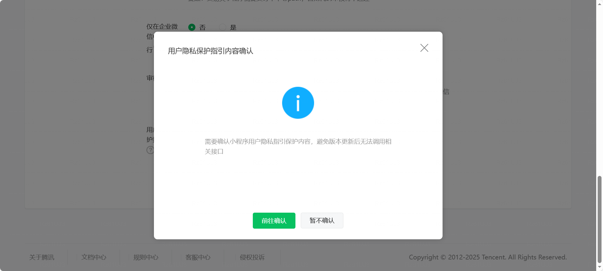 你好,请先检查是否更新或完善小程序《用户隐私保护指引》。可前往“https://mp.weixin.qq.com/登录你的小程序-左下角头像的账号设置-基础设置-服务内容声明模块”或代码提审时完善《用户隐私保护指引》。若于到期未完善,将回收小程序隐私接口调用权限,建议你尽快完善小程序得《用户隐私保护指引》。可参考:https://developers.weixin.qq.com/community/develop/doc/00062a6d514c88baacdf52e8a56009