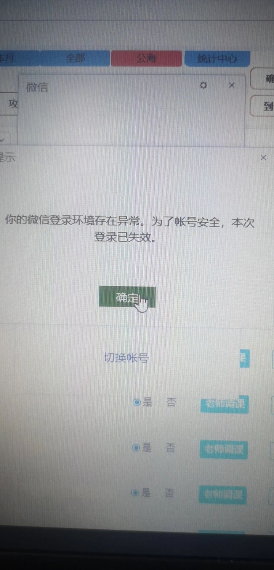 你好,提示“登录环境异常,本次登录失效,请重新登录”的问题,重新扫码登录即可,出现该提示一般是由于微信帐号被其它用户投诉导致(如:涉嫌频繁发送营销类广告骚扰信息等,请遵守微信使用规则,并规范个人行为,谢谢!)