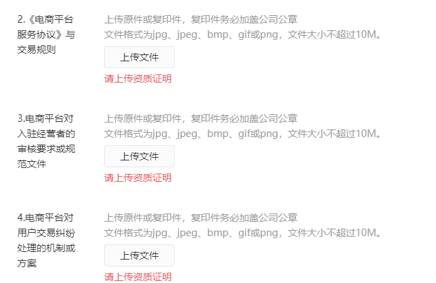 你好,电商平台服务协议、交易规则、电商平台对入驻经营者的审核要求或规范文件、电商平台对用户交易纠纷处理的机制或方案资质属于用户对使用小程序的用户及入驻商家的相关规范文件,相关资质为用户自身拟定,平台暂不提供模板。