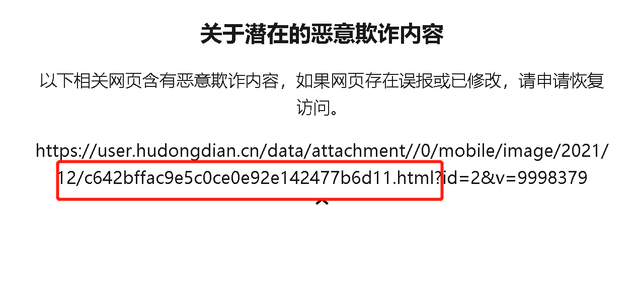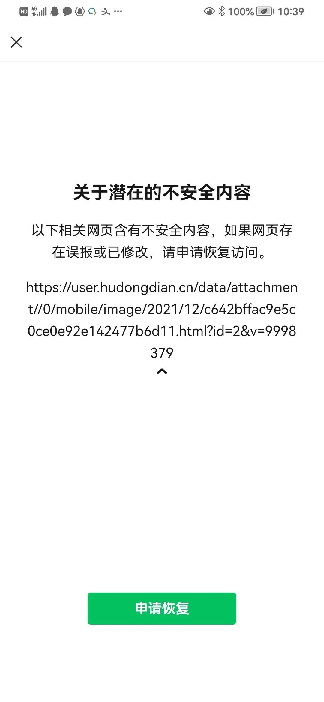 你好,经核实,域名user.hudongdian.cn下的链接【https://user.hudongdian.cn/data/attachment//0/mobile/image/2021/12/c642bffac9e5c0ce0e92e142477b6d11.html?id=2&v=9998379】的违规内容已经修改,现已恢复微信内直接访问的服务,请知悉。