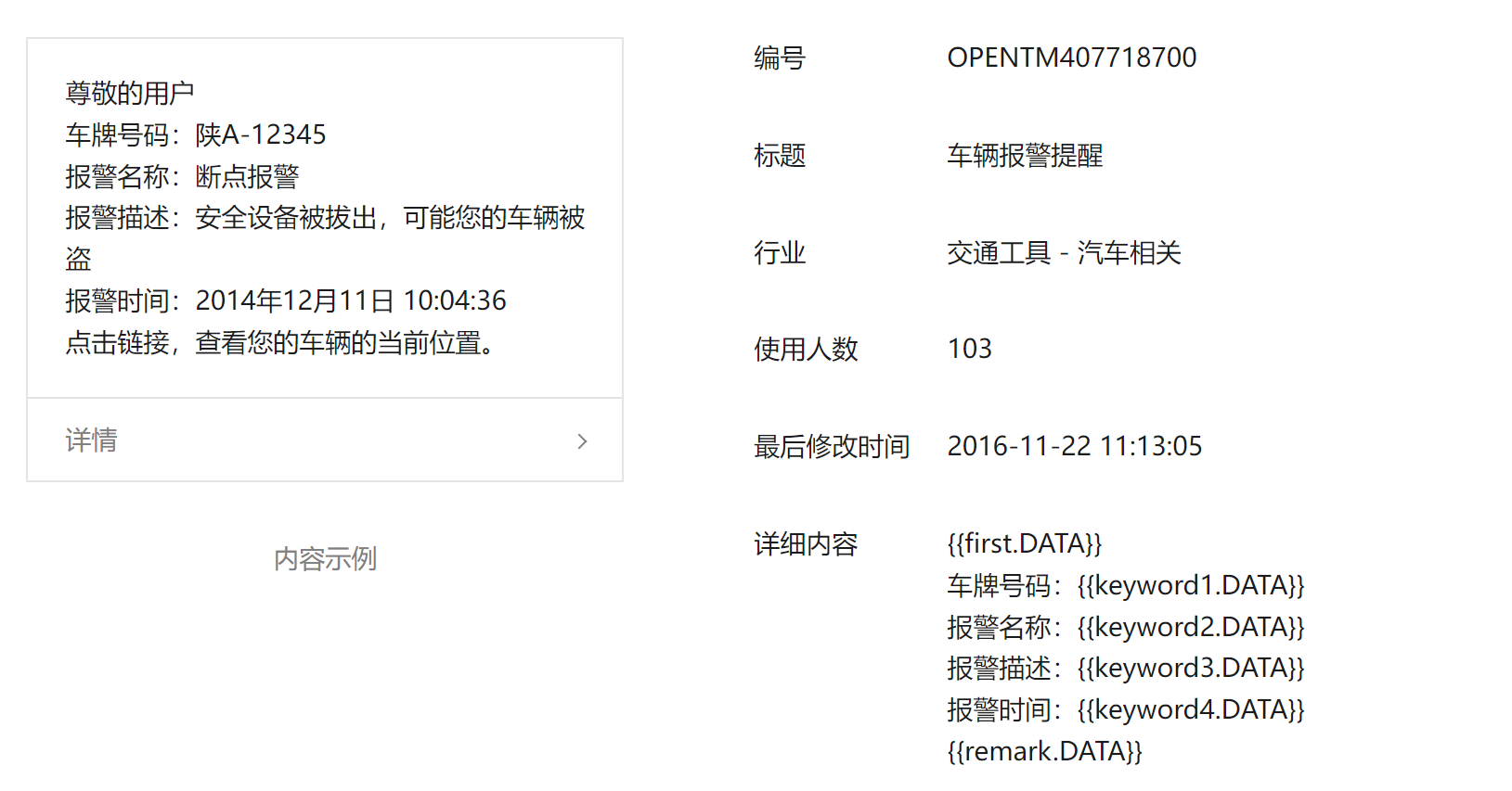 两个公众号使用同一个消息模板,推送信息也是一样的,但是两个公众号显示的信息是一致,消息模板编号:OPENTM407718700,模板标题:车辆报警提醒