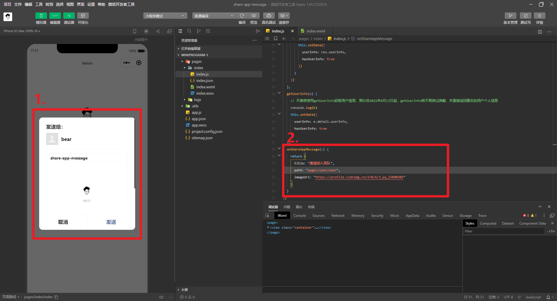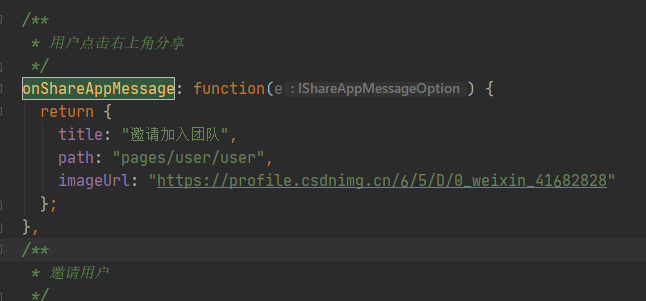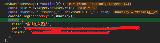 调试器:可以看到点击按钮已经进入了onShareAppMessage里了,