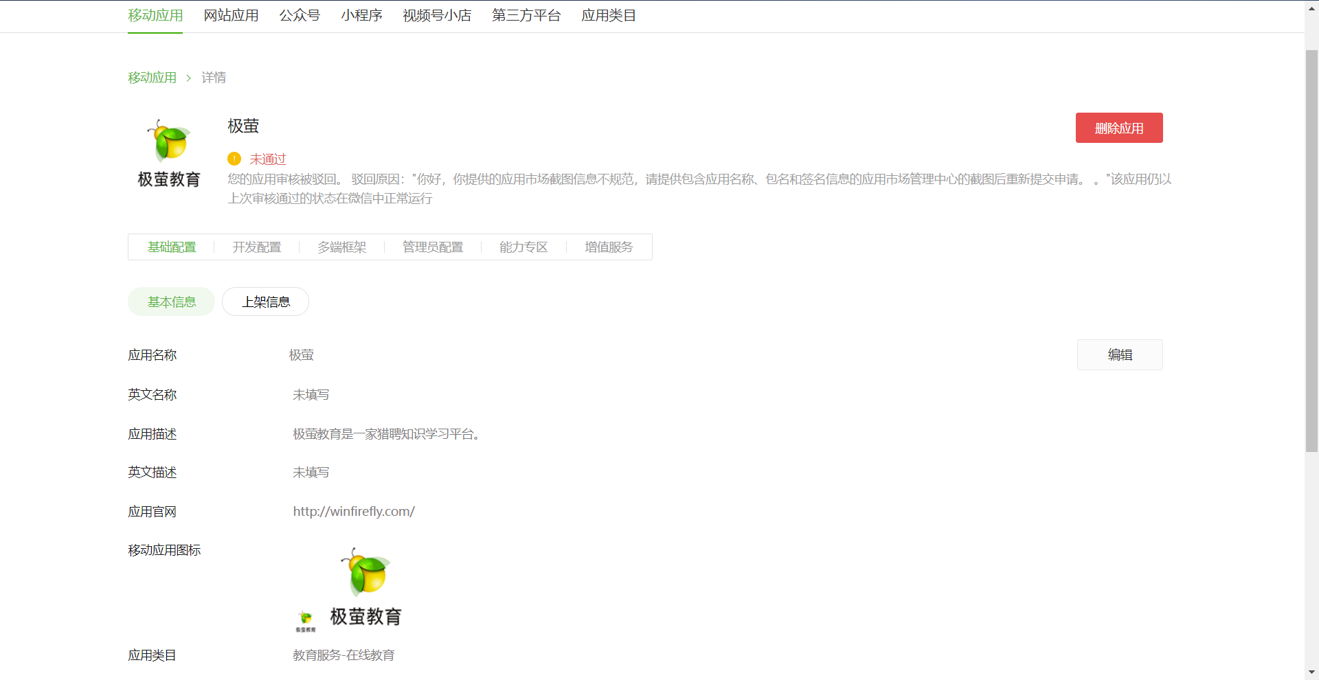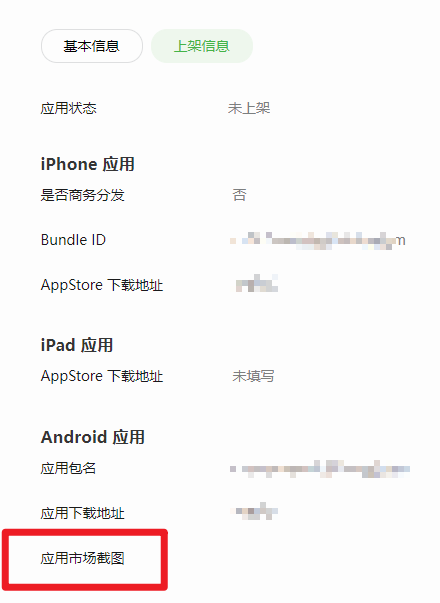 您的应用审核被驳回。 驳回原因:"你好,你提供的应用市场截图信息不规范,请提供包含应用名称、包名和签名信息的应用市场管理中心的截图后重新提交申请。 。"该应用仍以上次审核通过的状态在微信中正常运行。