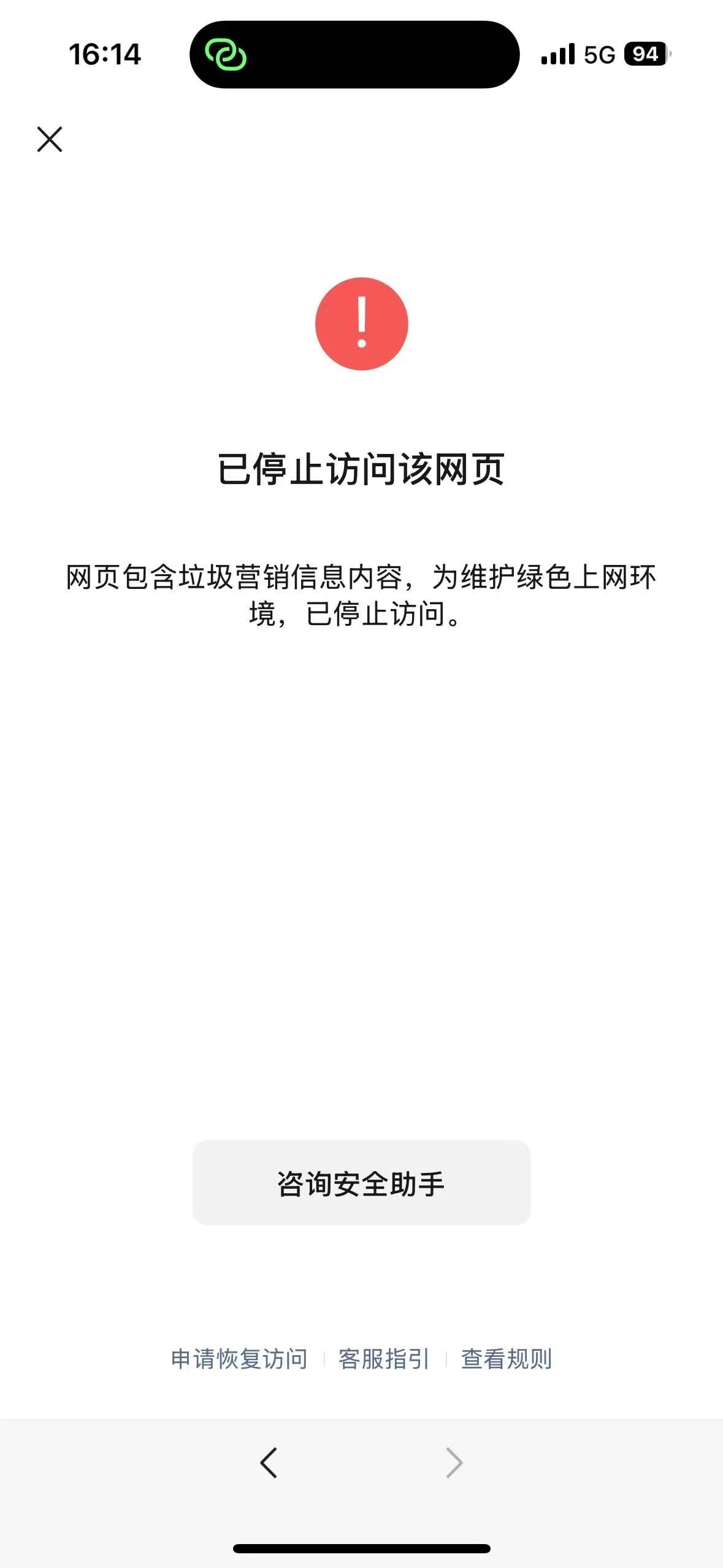 微信打开https://yuexiangcha.com/提示「已停止访问该网页,网页包含垃圾营销信息内容,为维护绿色上网环境,已停止访问」,我们的业务是合法合规的查询大数据报告,并且通过校验姓名,手机号和验证码确保三要素一致,符合国家关于个人信息保护法,请老师明察。