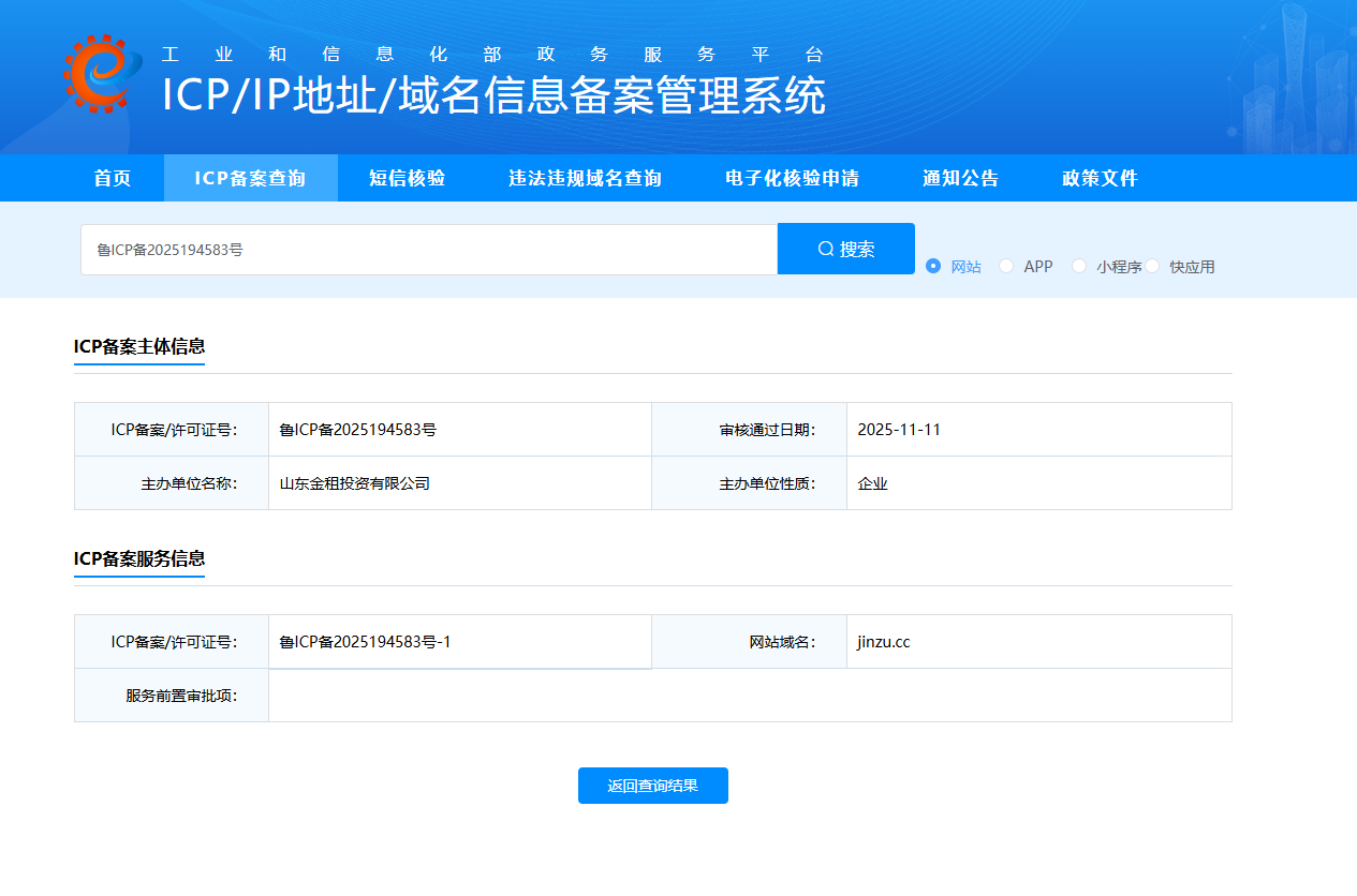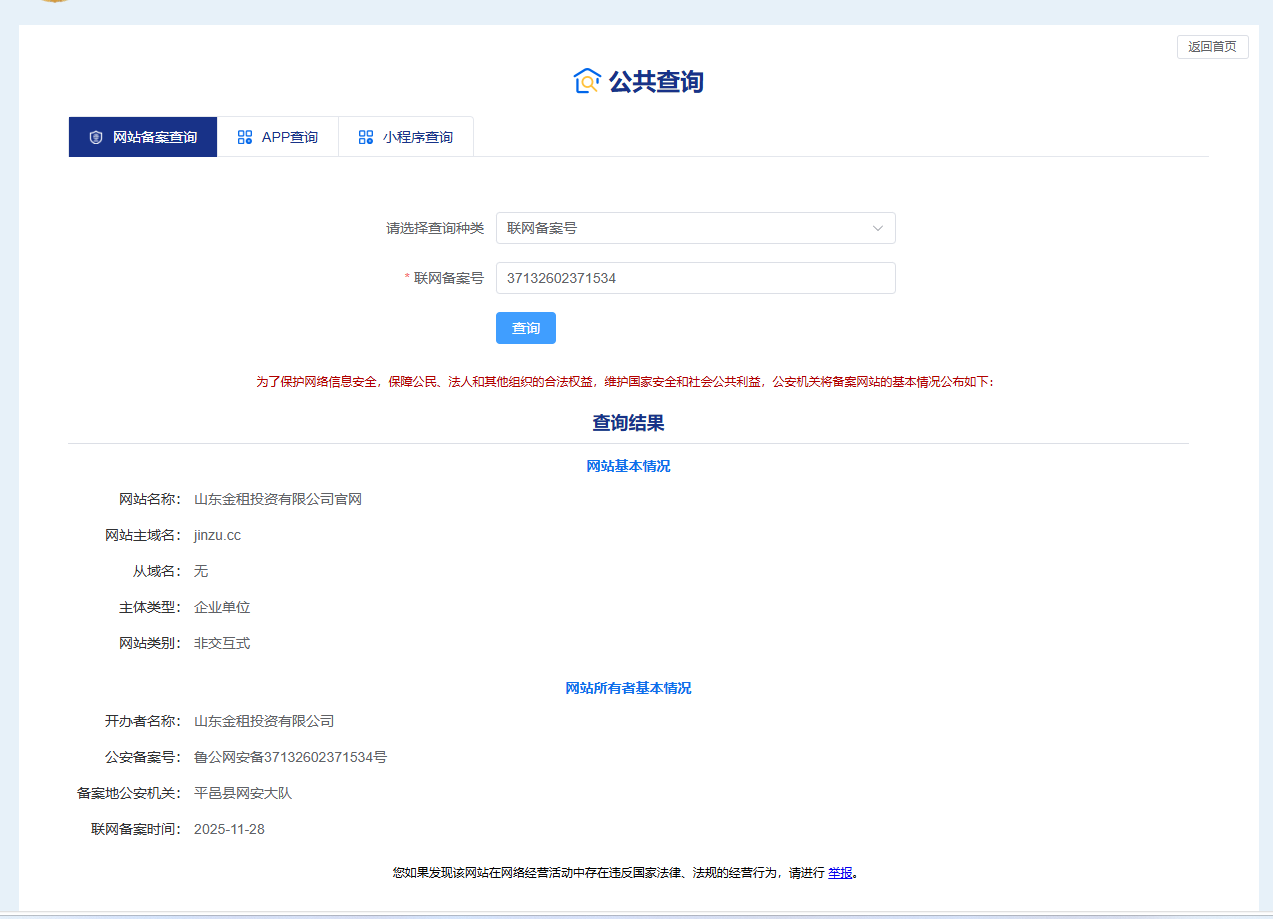 现申请对本公司官方网站(www.jinzu.cc)进行审核并通过白名单。我司是经依法注册的合规企业,公司名称:山东金租投资有限公司(代码:91371326MAEH5FY45W)已严格按照国家规定完成工信部与公安部双重备案(鲁ICP备2025194583号 / 鲁公网安备37132602371534号)。经腾讯安全反诈骗实验室自查,域名信誉正常。